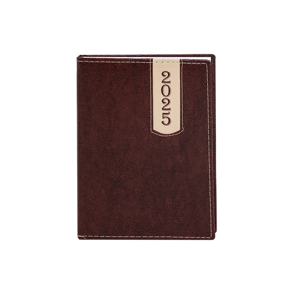 Agenda produzida em couro sintético, possui detalhes de costura e escrita do ano ?2025? na parte superior direita. Contém marca página em cetim, páginas de dados pessoais, calendário de 2024 à 2026, mapa do Brasil, mapa global, índice telefônico e planejamento.
