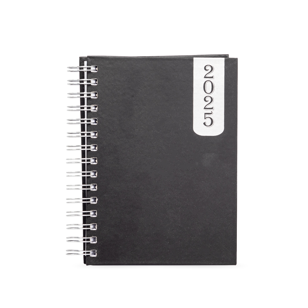 Agenda diária wire-o com capa produzida em prime, contém 344 páginas, bolso plástico atrás da capa, dados pessoais, calendário de 2024 à 2026, mapa do Brasil, mapa-múndi, índice telefônico e planejamento.