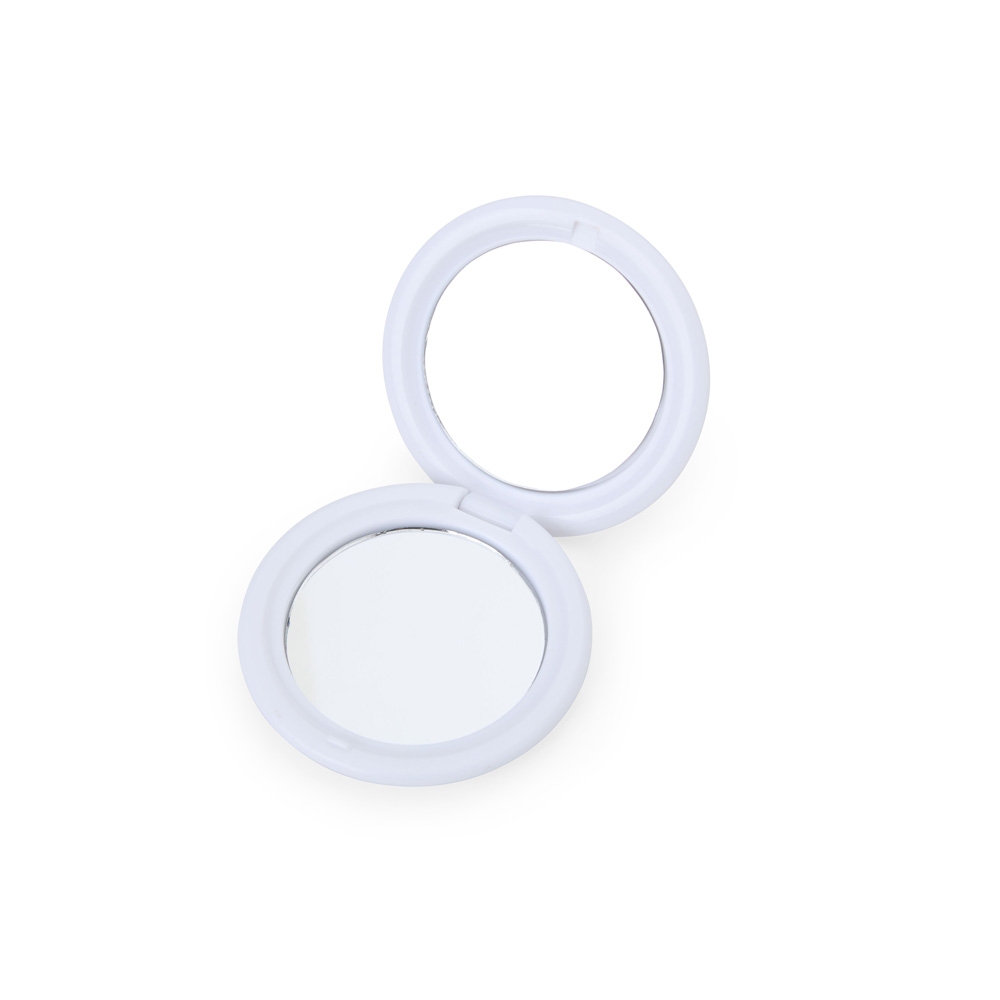Compacto e funcional, este espelho duplo de bolso é produzido em material plástico. Seu design diferenciado conta com centro plano e bordas em declive, proporcionando um acabamento moderno e elegante.