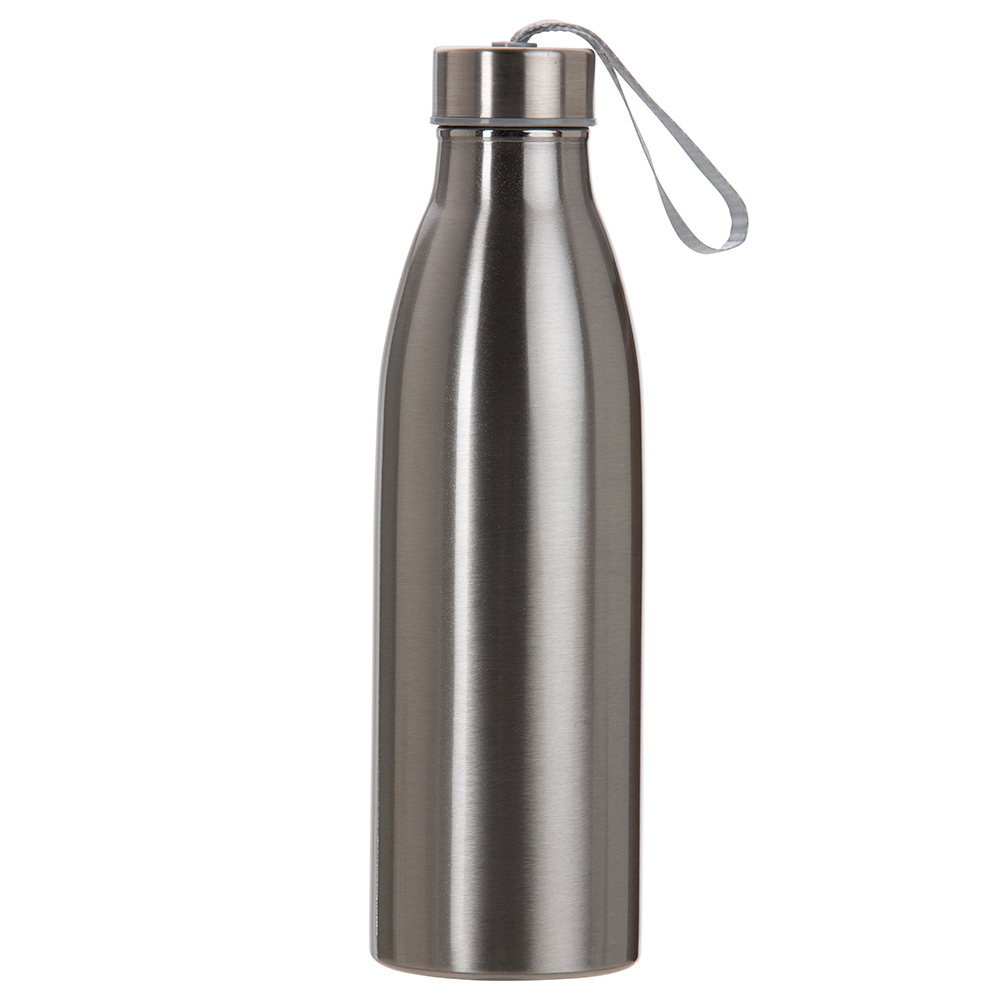 Garrafa de inox 750ml com tampa rosqueável e alça de nylon embutida.