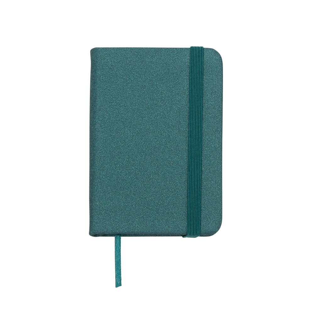 Mini Caderneta em material sintético brilhante com marcador de página em cetim e fita elástica para fechar. Contém aproximadamente 80 folhas amareladas sem pauta.